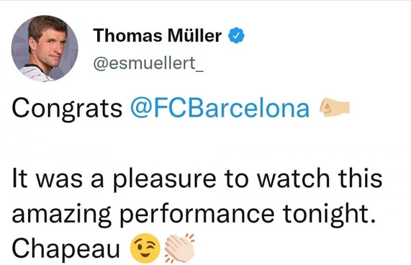 وقال مولر عبر حسابه الرسمي بـ تويتر تعليقا على فوز الفريق الكتالوني بالكلاسيكو: “مبروك برشلونة.. كان من دواعي سروري مشاهدة هذا الأداء الرائع الليلة، ترفع القبعة”، ويأتي تعليق توماس مولر في الوقت الذي بدأ فيه برشلونة استعادة جزء من بريقه المفقود، في ظل النتائج الكارثية التي سقط بها مؤخرا، وكان أخرها أمام بايرن ميونيخ في دوري الأبطال بنتيجة 8/2.