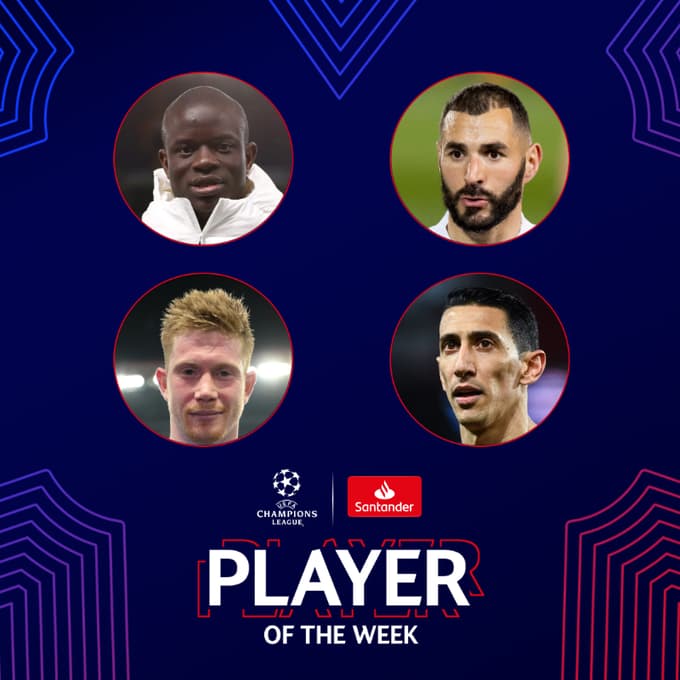 دخل النجم البلجيكي “كيفين دي بروين” لاعب فريق مانشستر سيتي الإنجليزي في المنافسه مع الفرنسي كريم بنزيما مهاجم ريال مدريد وكانتي لاعب تشيلسي ودي ماريا لاعب باريس على جائزة لاعب الأسبوع في دوري ابطال أوروبا.