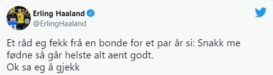 ونشر هالاند تغريده علي حسابه الرسمي بـ تويتر ترجمها مواطنه ومهاجم النرويج السابق “يان إيج فجورتوفت” : “قبل عامين، تلقيت نصيحة من مزارع: تحدث بقدميك ومن ثم يفضل أن تكون الأشياء الأخرى جيدة” . “قلت حسناً. وأنطلقت.”، ولم يعلن هالاند بعد عن القرار النهائي بشأن مستقبله، ويهتم عملاقي الليجا بالتعاقد معه، حيث يرغب ريال مدريد في إقامة شراكة هائلة مع كيليان مبابي في خط الهجوم، ويرى برشلونة أنه النجم المحتمل للتوقيع معه في الصيف.