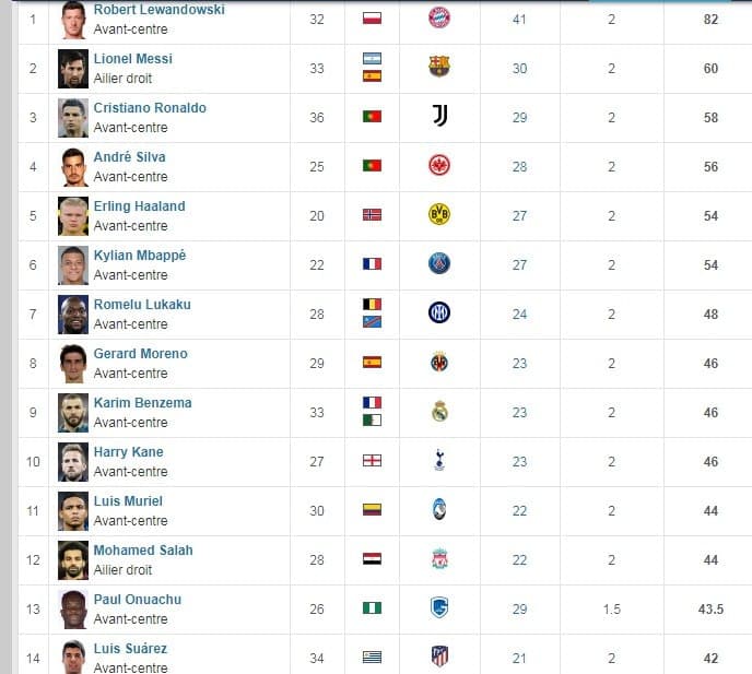 وجاء البرتغالي “أندريه سيلفا” مهاجم فرانكفورت رابعاً برصيد 56 نقطة من 28 هدفاً والنرويجي “إيرلينج هالاند” مهاجم دورتموند برفقة الفرنسي “كيليان مبابي” في المركز الخامس برصيد 54 نقطة من 27 هدفاً واحتل روميلو لوكاكو المركز السابع برصيد 48 نقطة من 24 هدفاً وبعده هاري كين ومهاجم فياريال الإسباني جيرارد مورينو ومهاجم ريال مدريد الفرنسي كريم بنزيما برصيد 46 نقطة من 23 هدف.