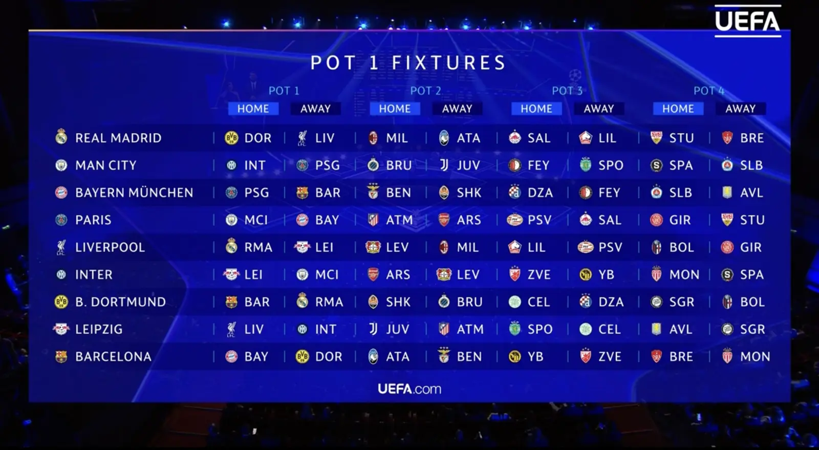 نتائج قرعة دوري أبطال أوروبا كالتالى: