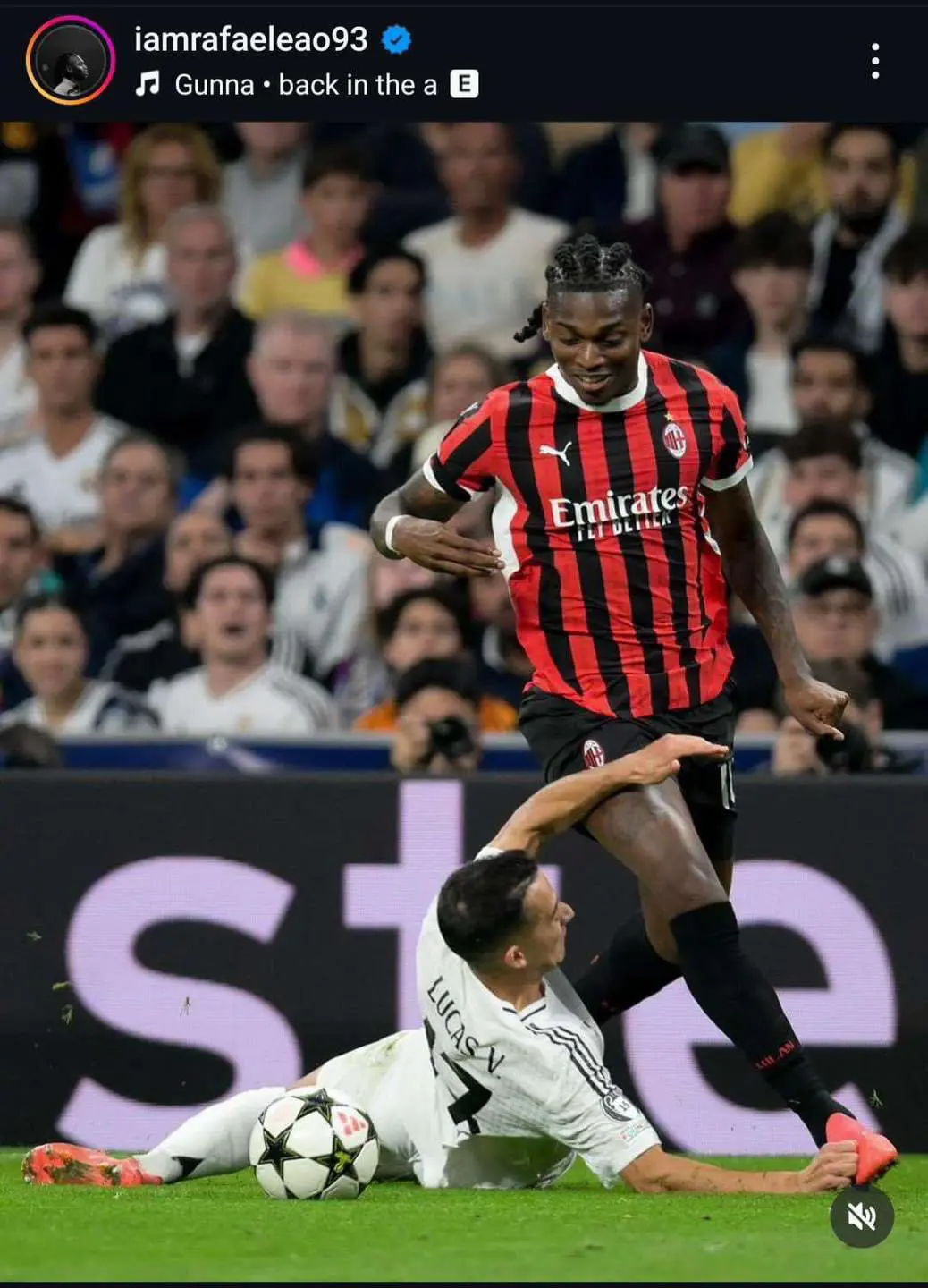 أطلق البرتغالي “رفائيل لياو” نجم فريق ميلان الإيطالي، سخرية على انتصار فريقه ضد ريال مدريد في المباراة التي أقيمت بينهما مساء أمس الثلاثاء. قام بنشر صورة عبر حسابه على “إنستغرام” اعتبرها العديد بأنها مسيئة للفريق الملكي.