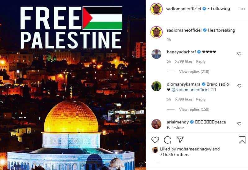 ونشر ساديو مانى صورة على حسابه الشخصى بموقع “انستجرام” للمسجد الأقصى وفى الأعلى علم فلسطين وعبارة “الحرية لفلسطين” وقد تعرض أهالي حي الشيخ جراح بفلسطين لعمليات قتل واعتداءات عنيفة من قبل قوات الاحتلال خلال الأيام القليلة الماضية إلى جانب اقتحام شرطة الاحتلال ساحات المسجد الأقصى.