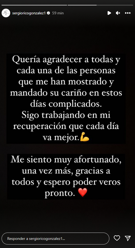 الشاب البالغ من العمر 29 عامًا ، والذي جاء من خلال أكاديمية إشبيلية ، ” يتحسن بسرعة فائقة ” ، كما أوضحت زوجته ألبا سيلفا في حديث لـ “يوروبا برس”: “لقد وضع سيرجيو الكثير من القوة وعزيمته هي التي اجبرته علي التعافي”.