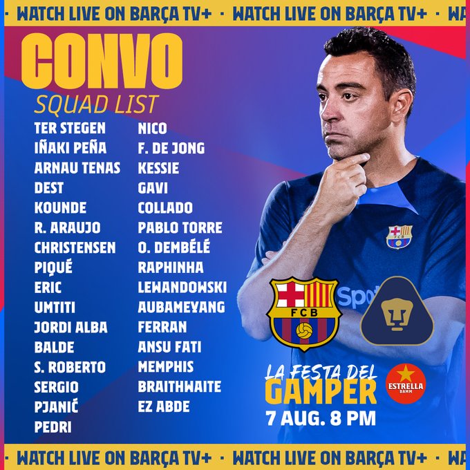 أعلن نادي برشلونة عن قائمة الفريق التي أختارها المدرب الإسباني “تشافي هيرناندز” لخوض مباراته أمام بوماس المكسيكي والتي ستقام غداً الأحد 7 أغسطس في تمام الساعة 9:00 مساءً بتوقيت مكة ضمن منافسات كأس خوان جامبر الودي.