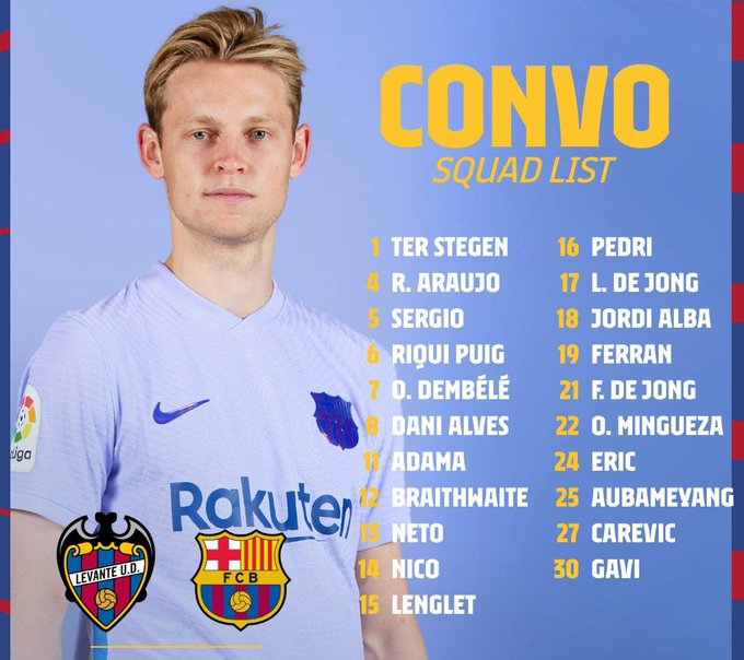 أعلن نادي برشلونة عبر موقعه الرسمي عن قائمة الفريق التي أختارها المدرب الإسباني “تشافي هيرناندز” لخوض مباراته أمام ليفانتي والتي ستقام غداً الأحد 10 أبريل في الساعة 10:00 مساءً بتوقيت مكة ضمن منافسات الجولة 31 من الدوري الإسباني.