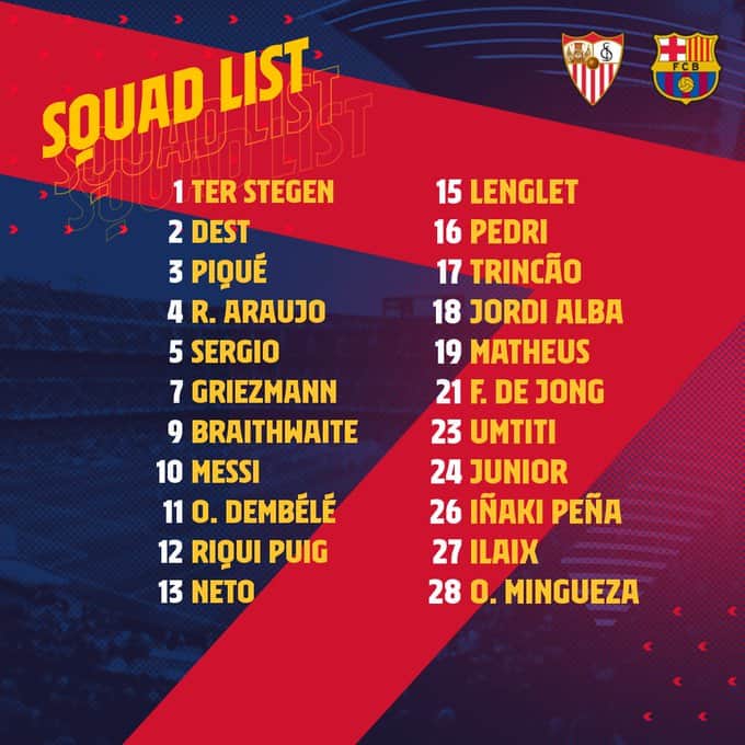أعلن نادي برشلونة عبر موقعه الرسمي عن قائمة الفريق التي اختارها المدرب “رونالد كومان” لخوض مباراة إشبيلية والتي ستقام غداً اسبت في الساعة 6:15 مساءً بتوقيت مكة على ملعب “رامون سانشيز بيزخوان” ضمن منافسات الجولة 25 من الدوري الإسباني.