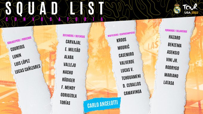 وشهدت قائمة المدرب الإيطالي كارلو أنشيلوتي المدير الفني للريال تواجد الصفقتين الجديدتين لنادي ريال مدريد وهما أنطونيو روديجر وأوريلين تشواميني الذين انتقلا من تشيلسي وموناكو خلال الأسابيع الماضية، حيث يستعد الريال لخوض 3 مباريات ودية في أمريكا أولها برشلونة في كلاسيكو جديد ثم مواجهة كلوب أمريكا وأخيرًا يوفنتوس، ثم تنتظره مباراة السوبر الأوروبي يوم 10 أغسطس أمام فرانكفورت الألماني.