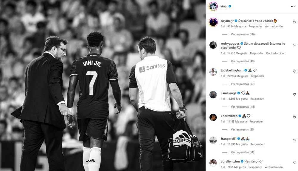 وعلق العديد من زملائه مثل رودريجو وفيدي فالفيردي وكامافينجا وميليتاو وبيلينجهام وفران جارسيا على منشوره ليرسلوا له رسائل التشجيع والمودة، كما فعل مواطنه نيمار، وسيغيب النجم البرازيلي عن مباراة الديربي ضد أتلتيكو مدريد يوم 24 سبتمبر القادم وسيصل في الوقت المناسب لمباراة الكلاسيكو ضد برشلونة يوم 29 أكتوبر.