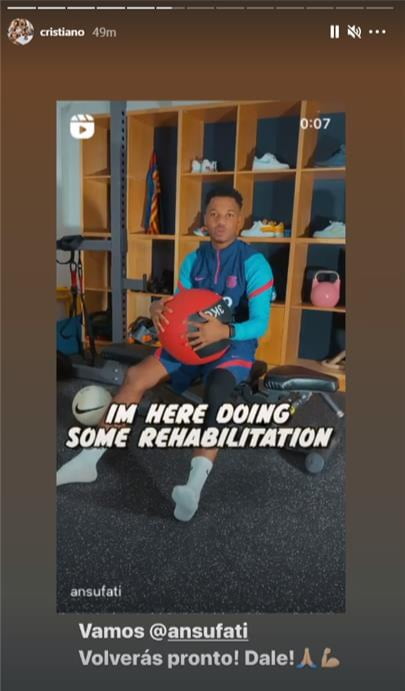 ونشر رونالدو عبر حسابه بـ إنستجرام قائلاً :”هيا يا أنسو ستعود قريباً.. قبل بضع سنوات قد تعرضت لإصابة خطيرة كسر في الساق والشظية وقضيت ما يقرب من عام دون أن أكون قادراً على اللعب وكانت هناك أيام عديدة من المعاناة والألم ولكن أيضاً تعلمت الكثير من ذلك لقد ساعدني ذلك على تقدير تفاصيل صغيرة”.