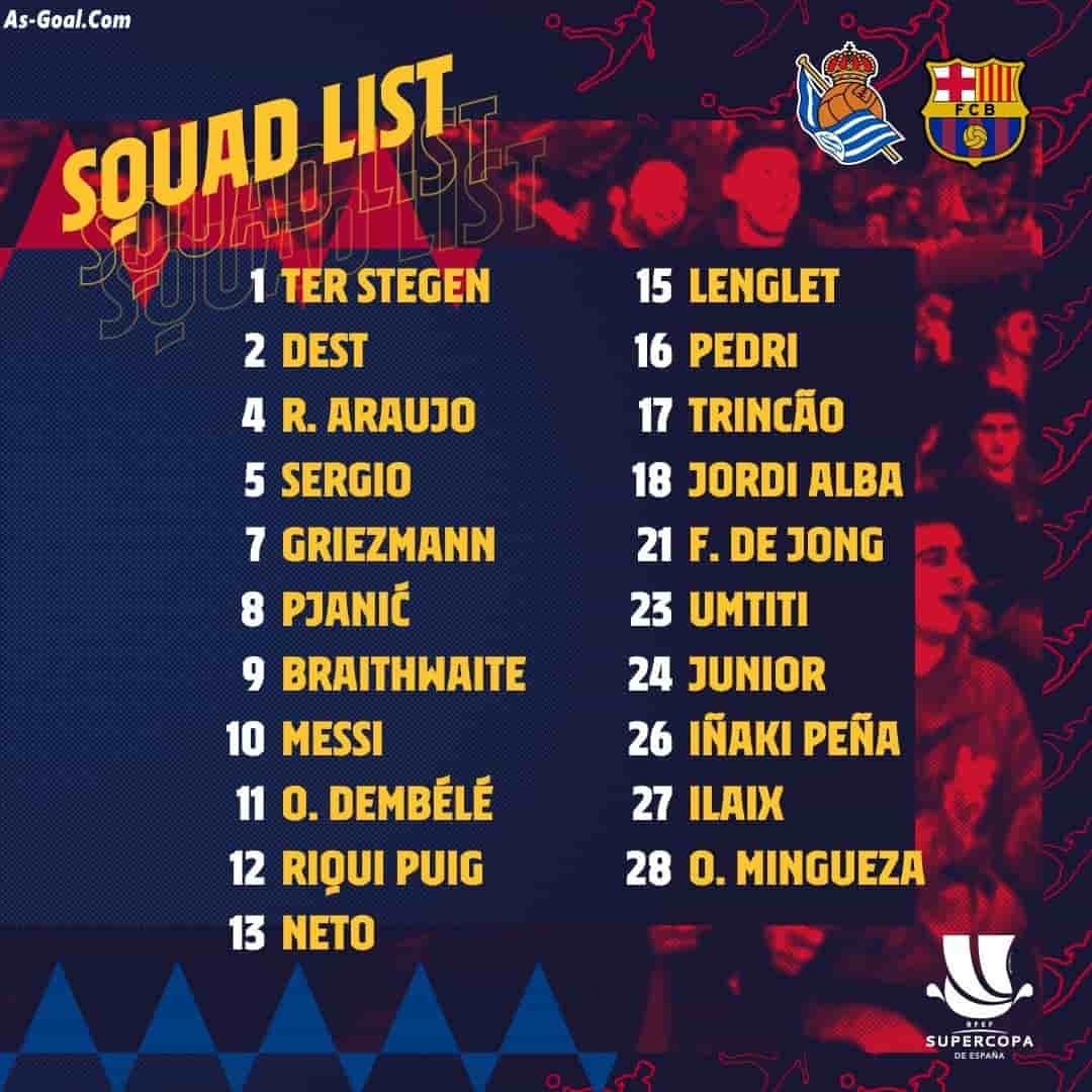وضمت قائمة البرسا بـ 21 لاعباً لخوض منافسات كأس السوبر الإسباني وجاء النجم الأرجنتيني ليونيل ميسي قائد الفريق على رأس القائمة وضمت القائمة المدافع “رونالد أراخو” الذي أصيب بإجهاد عضلي بالمباراة الأخيرة بينما عاد كليمو لينجليه للظهور مرة أخرى بعد انتهاء إيقافه لتراكم الإنذارات.