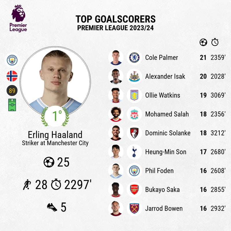 وجاء جدول هدافي الدوري الإنجليزي الممتاز 2023-24 كالتالي: