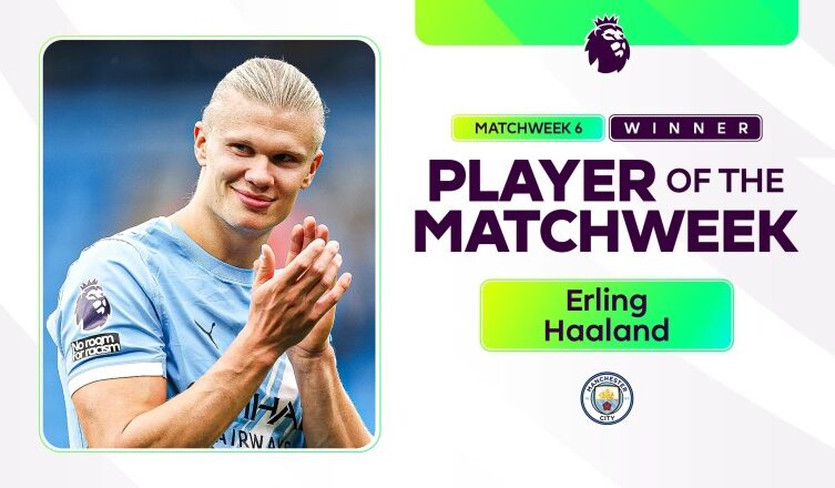 توج النجم النرويجي إيرلينج هالاند مهاجم مانشستر سيتي بجائزة لاعب الجولة السادسة في الدوري الإنجليزي الممتاز، بعد تألقه اللافت خلال مباراة فريقه ضد بيرنلي التي انتهت بفوز السيتيزينز بنتيجة 5-1.