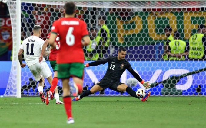 تعادل منتخب البرتغال أمام منتخب سلوفينيا بنتيجة 0/0 في الأشواط الاصلية والإضافية، والفوز بنتيجة 3/0 بركلات الترجيح في المباراة التي جمعتهما علي ملعب “دوتشه بنك بارك”، في دور الـ16 لبطولة كأس الأمم الأوروبية “يورو 2024”.