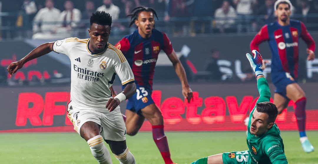 وقد أفتتح فينسيوس جونيور التسجيل لنادي ريال مدريد في الدقيقة 7 من المباراة، وسرعان ما اضاف البرازيلي فينسيوس من جديد الهدف الثاني في الدقيقة العاشرة، وفي الدقيقة 33 قلص روبرت ليفاندوفسكي الفارق بهدف لصالح برشلونة، وسجل فينيسيوس الهدف الثالث “هاتريك” في الدقيقة 38 من عمر المباراة من ركلة جزاء.