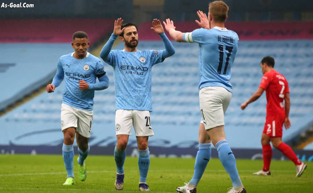 وسجل برناردو سيلفا النتيجة للسيتي بالدقيقة 8 من تسديدة رائعة على الطائر من داخل منطقة الجزاء ثم أحرز بيرناردو هدف ثاني بالدقيقة 15 بعد تمريرة من كيفين دي بروين ثم أكمل فيل فودين ثلاثية السيتي في الدقيقة 33 من تسديدة يسارية متقنة بعد أن تلقى تمريرة من الجزائري رياض محرز.
