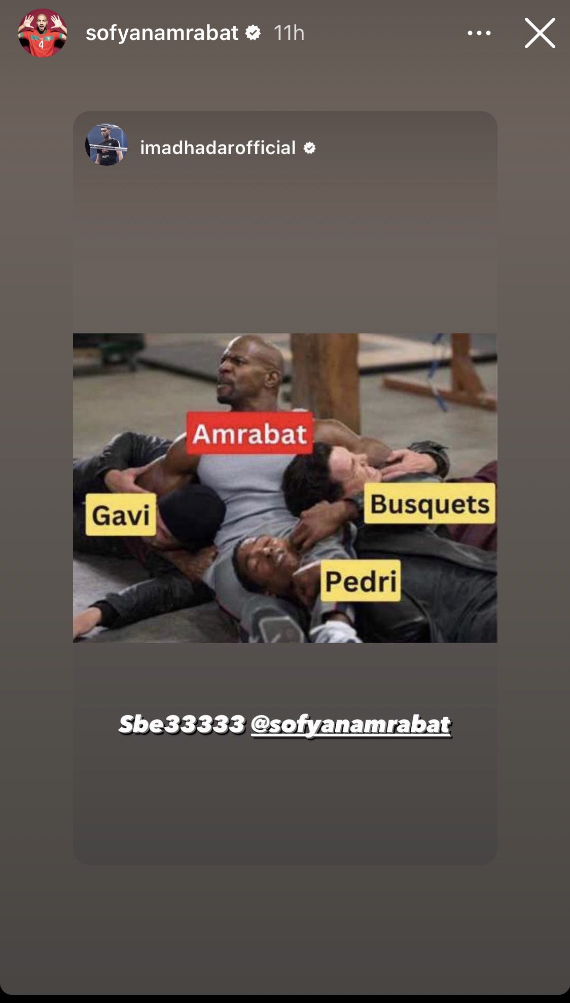 وقد شارك سفيان أمرابط “كوميك” عبر حالته اليومية بحسابه الرسمي علي تطبيق “إنستجرام” والذي ظهر فيه بشكل ساخر يقوم بتقييد جافي وسيرجيو بوسكيتس وبيدري جونزاليس لاعبي خط وسط منتخب إسبانيا، وحظت الصورة التي شاركها على اهتمام الكثير من رواد مواقع التواصل الإجتماعي.