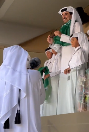 أمير قطر يتوشح بالعلم السعودي خلال متابعته مباراة الأرجنتين والسعودية