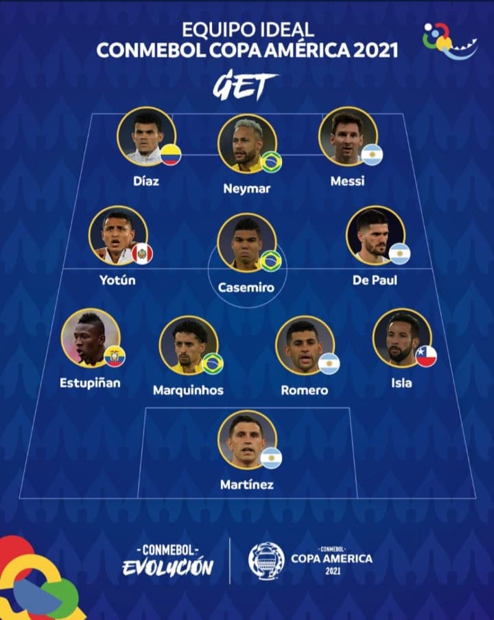 أعلن إتحاد أمريكا الجنوبية لكرة القدم منذ قليل على صفحته الرسمية على تويتر التشكيلة المثالية لكوبا أمريكا التي شهدت تتويج المنتخب الأرجنتيني بعد غياب طويل على حساب المنتخب البرازيلي.