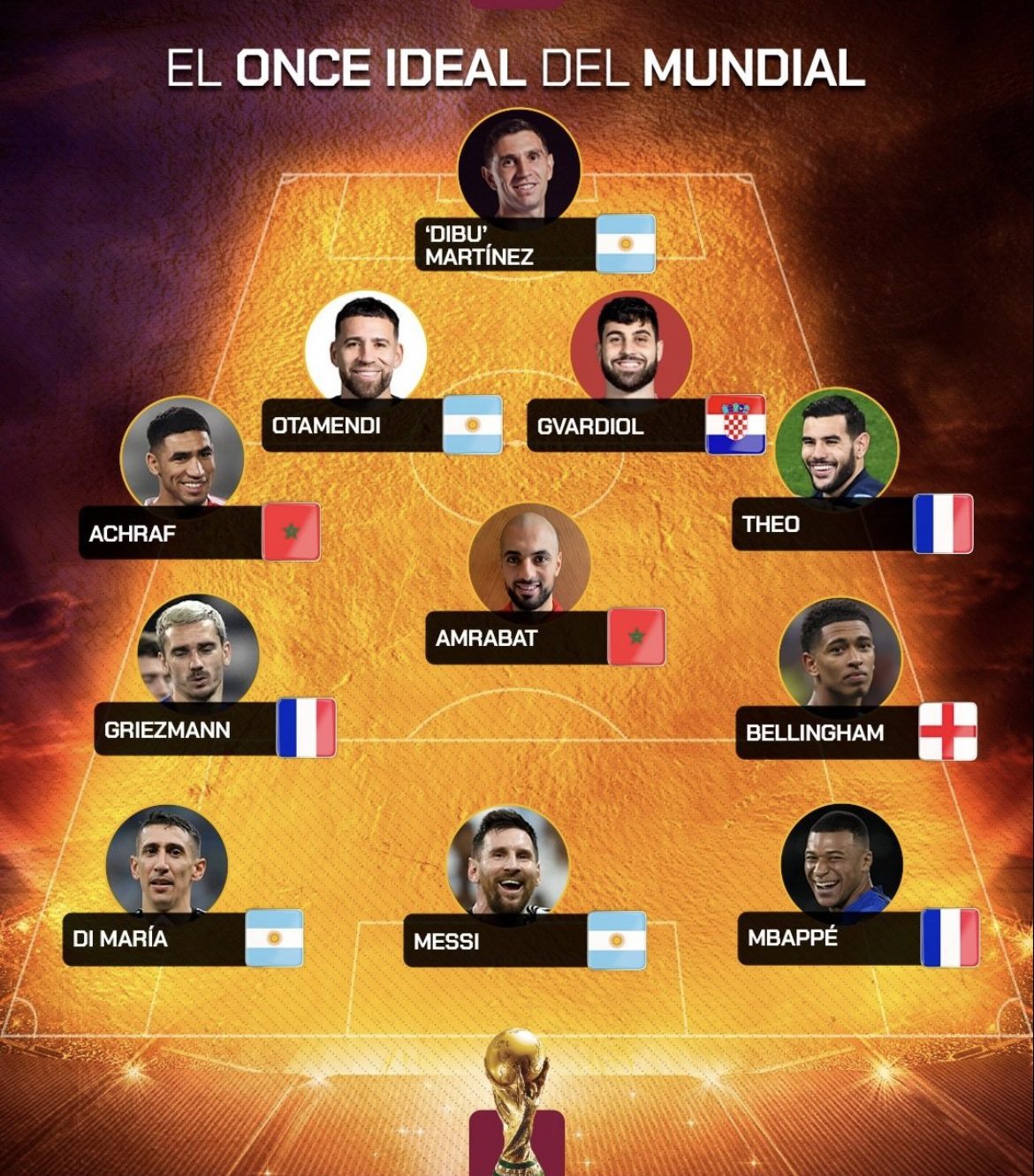 كشفت تقارير صحفية إسبانية عن التشكيل المثالي الخاص بمنافسات كأس العالم قطر 2022، والذي انتهى بتتويج منتخب الأرجنتين باللقب بعدالفوز على فرنسا بركلات الترجيح 4/2 في المباراة النهائية التي أقيمت أمس على استاد “لوسيل”.