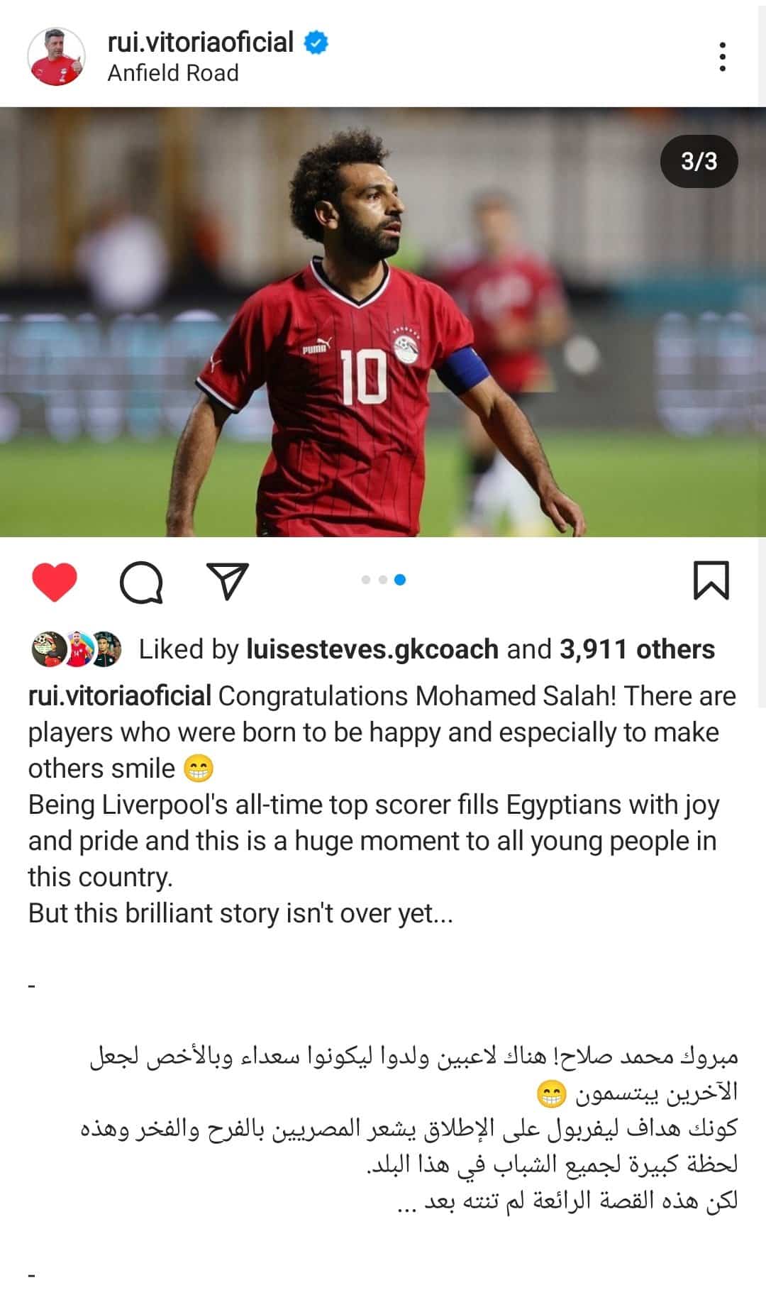 ونشر روي فيتوريا عبر حسابه الرسمي علي “إنستجرام” صورة لمحمد صلاح وعلق عليها: “مبروك محمد صلاح، هناك لاعبين ولدوا ليكونوا سعداء وبالأخص لجعل الآخرين يبتسمون، كونك هداف ليفربول على الإطلاق يملأ المصريين بالفرح والفخر وهذه لحظة كبيرة لجميع الشباب في هذا البلد، لكن هذه القصة الرائعة لم تنته بعد”.