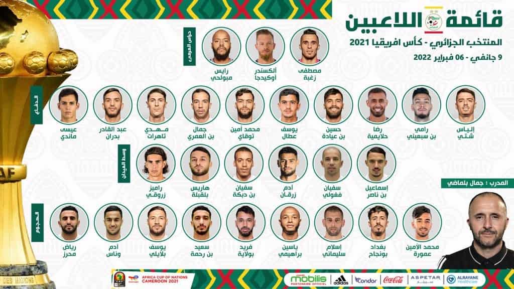 أعلن المدرب “جمال بلماضي” المدير الفني لمنتخب الجزائر عن قائمة اللاعبين استعدادا لبطولة كأس أمم إفريقيا 2021 المقامة في الكاميرون خلال الفترة من 9 يناير إلى 6 فبراير 2022.