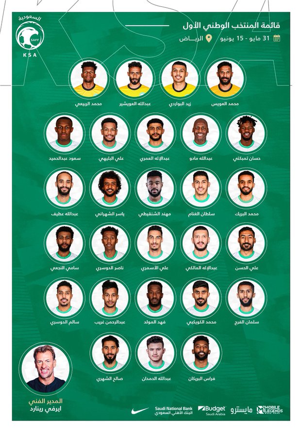 أعلن المدرب “هيرفي رينارد” المدير الفني لمنتخب السعودية اليوم الأربعاء عن قائمة المنتخب السعودي للمشاركة في المعسكر الإعدادي خلال الفترة من 31 مايو إلى 15 من شهر يونيو القادم استعدادًا للتصفيات الآسيوية المشتركة المؤهلة لكأس العالم 2022 وكأس آسيا 2023