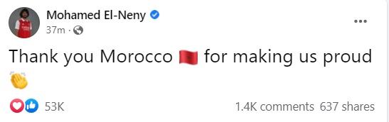 وقال النني على صفحته الرسمية بالفيسبوك: “شكراً لك يا مغرب لقد جعلتومنا فخورين”، وجاء ذلك بعد تقديم بطولة تاريخية، وصل فيها إلى نصف نهائي كأس العالم كأول منتخب إفريقي وعربي يبلغ هذا الإنجاز تاريخياً، وقد أنتصرت فرنسا على المغرب بهدفيين نظيفين.