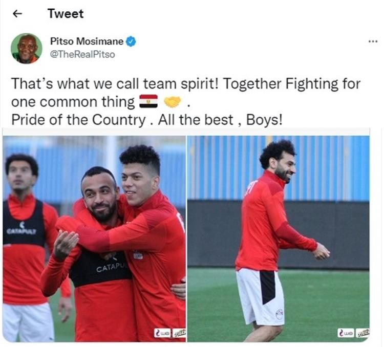 ونشر موسيماني من خلال حسابه الرسمي بموقع التواصل الاجتماعي “تويتر”، تغريدة تحمل صور لاعبي المنتخب المصري بتواجد أفشة وإمام عاشور وهم متعانقين وعلق قائلاً: “هذا ما نسميه روح الفريق!، معًا نتكاتف للقتال على هدف واحد فقط.. فخر الوطن، كل التوفيق للاعبين”.