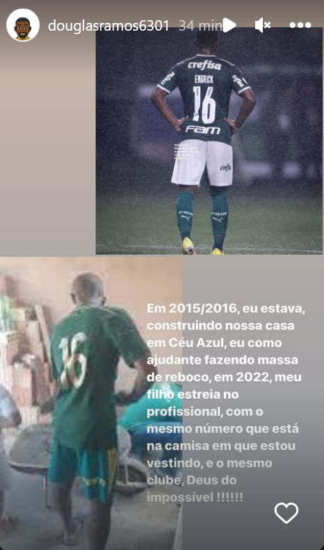 وأضاف دوجلاس راموس: “وبعد سنوات من محاولته اللعب كمحترف، أرسلت صورًا لابني إندريك إلى الأندية في ساو باولو، وكان بالميراس هو النادي الوحيد الذي يضمن وظيفة لي كعامل نظافة، وهو شرط ليتمكن من الانتقال من تاجواتينجا في المقاطعة الفيدرالية إلى مدينة ساو باولو، ووصلت إلى بالميراس كعامل نظافة، وكان ابني يبلغ من العمر 11 عامًا حينها كان لاعب في أكاديمية النادي، ووقع اليوم عقداً مع ريال مدريد سيحول حياة عائلتنا بالكامل إلى الأفضل”.